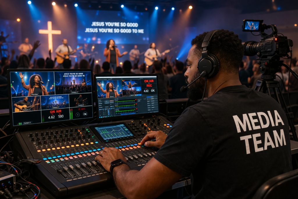 The Media & Production Team supports the worship experience through sound, video, and visual media. This ministry helps ensure that services run smoothly and allows our worship services to be shared online so people can stay connected wherever they are.